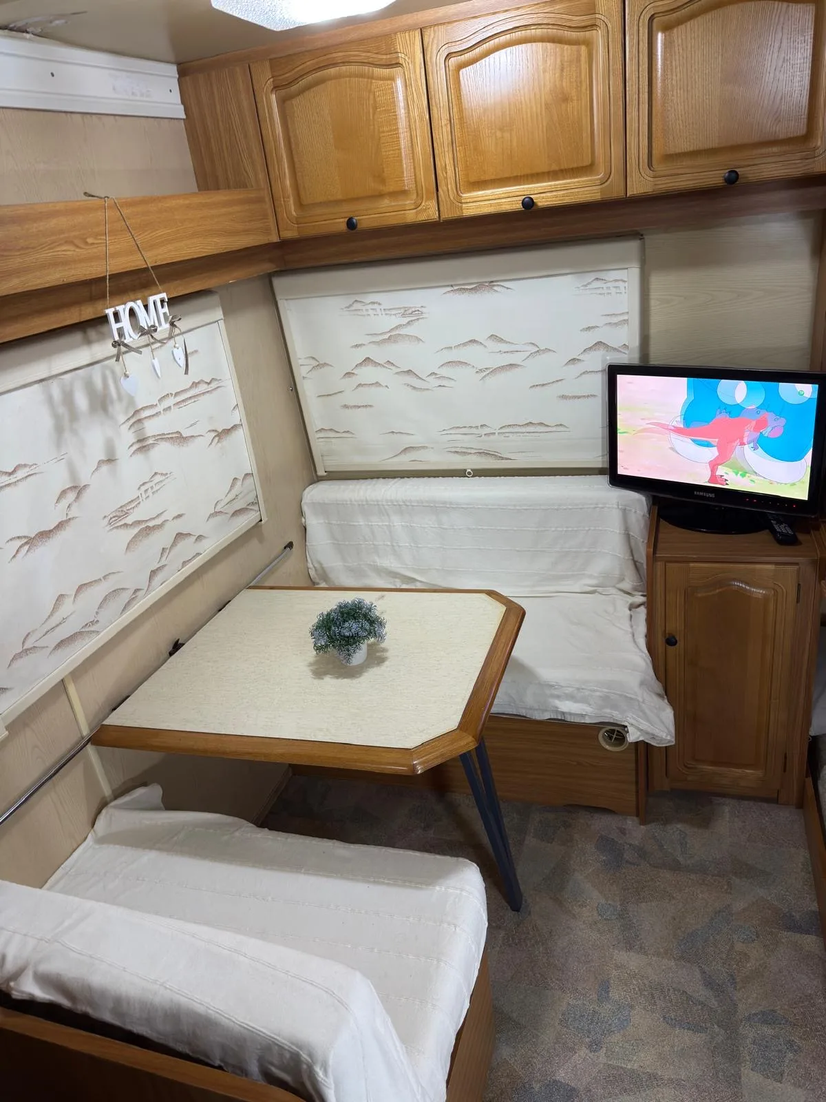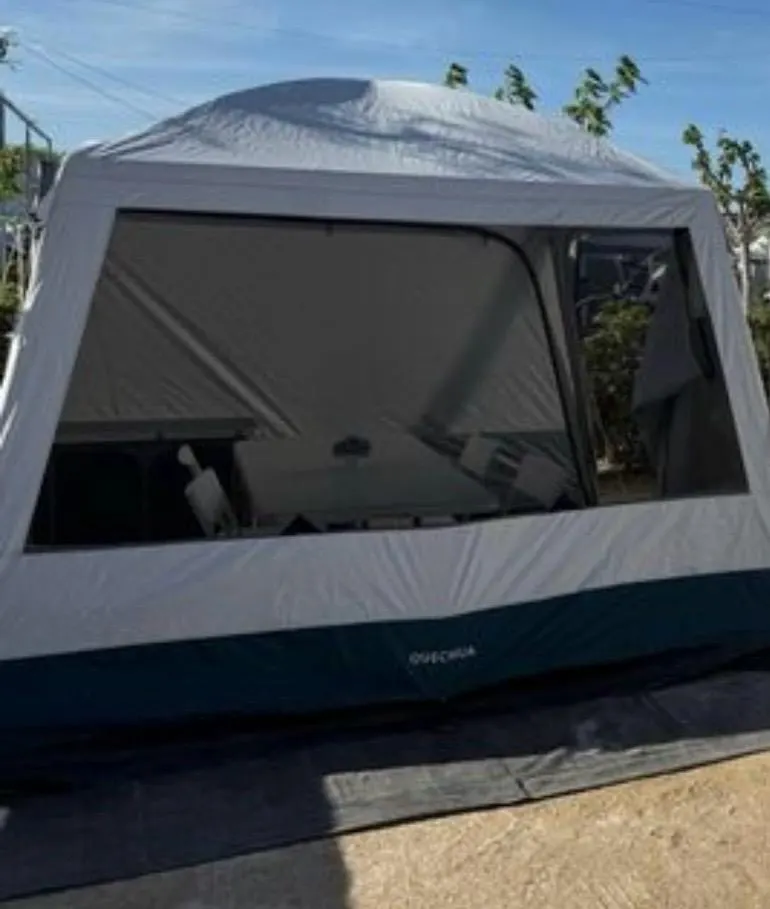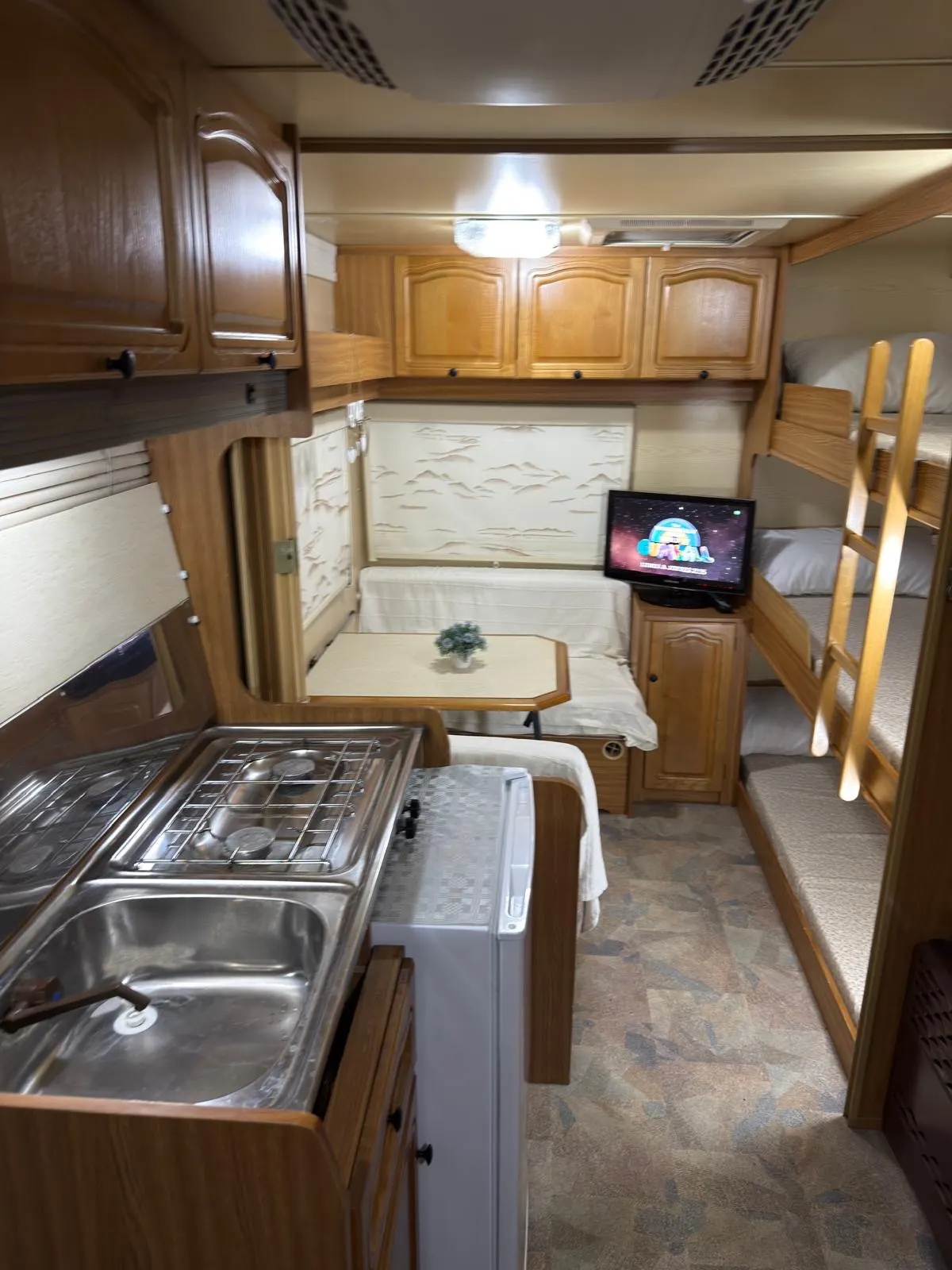 Se alquila Caravana Moncayo Mallorca para hasta 7 personas en campings de Murcia, Alicante y alrededores, como el Camping La Marina o Camping Alannia Costa Blanca, Camping Alannia Guardamar y otros de la zona. Te la llevamos e instalamos a campings en el radio de kilómetros indicado en el apartado "Radio Km". A un lado nos encontramos con una literas de 3 camas de 70 de ancho y enfrente una cama de 1,05, en la parte central tenemos un aseo (solo lavamanos y WC portátil), al final de la caravana nos encontramos con la cama de matrimonio de 1,35 de ancho, en el lado que nos queda junto a la puerta de acceso tenemos el menaje necesario, que se lo incluimos, frigorífico con congelador, microondas y TV con Smart TV. Soy flexible en las horas de llegada y salida. Consúltame para concretar.