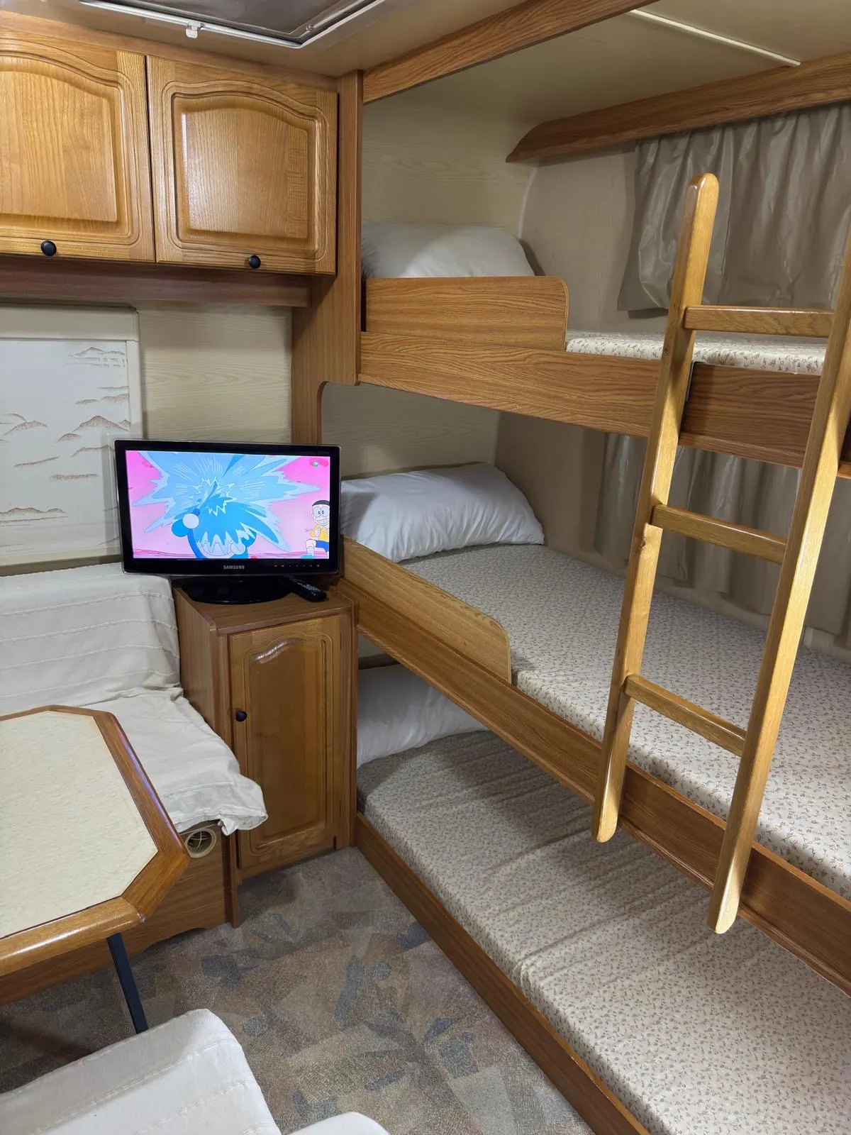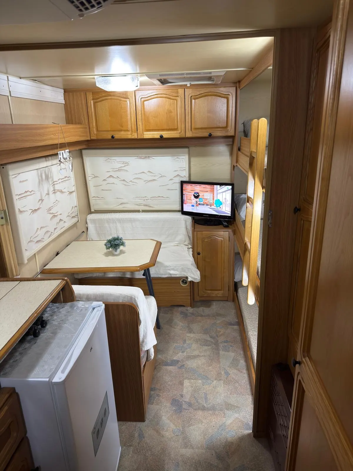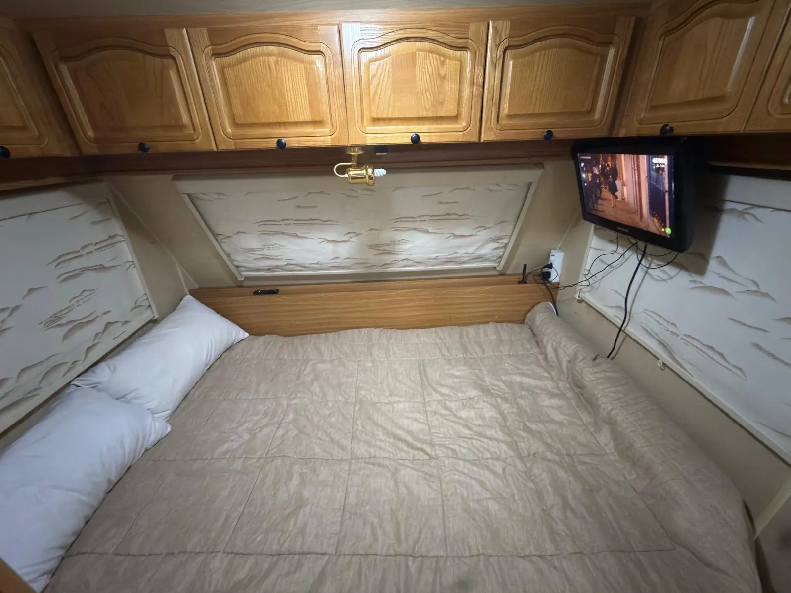 Se alquila Caravana Moncayo Mallorca para hasta 7 personas en campings de Murcia, Alicante y alrededores, como el Camping La Marina o Camping Alannia Costa Blanca, Camping Alannia Guardamar y otros de la zona. Te la llevamos e instalamos a campings en el radio de kilómetros indicado en el apartado "Radio Km". A un lado nos encontramos con una literas de 3 camas de 70 de ancho y enfrente una cama de 1,05, en la parte central tenemos un aseo (solo lavamanos y WC portátil), al final de la caravana nos encontramos con la cama de matrimonio de 1,35 de ancho, en el lado que nos queda junto a la puerta de acceso tenemos el menaje necesario, que se lo incluimos, frigorífico con congelador, microondas y TV con Smart TV. Soy flexible en las horas de llegada y salida. Consúltame para concretar.