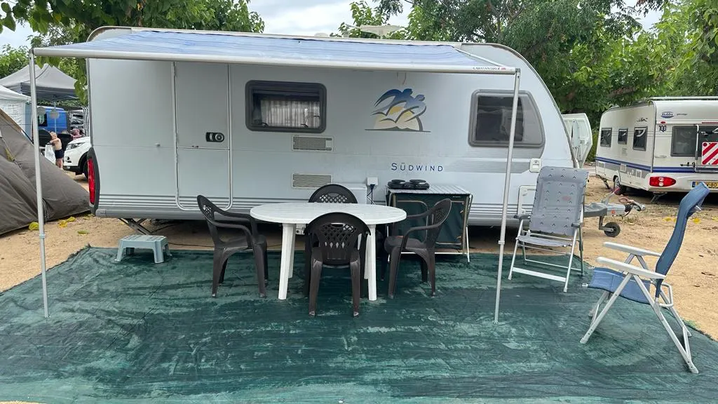 Se alquila caravana de 3 ambientes con toldo, suelo, mesa y sillas, cocina y nevera de exterior, menaje de cocina, utensilios de limpieza y cable conexión 220v.